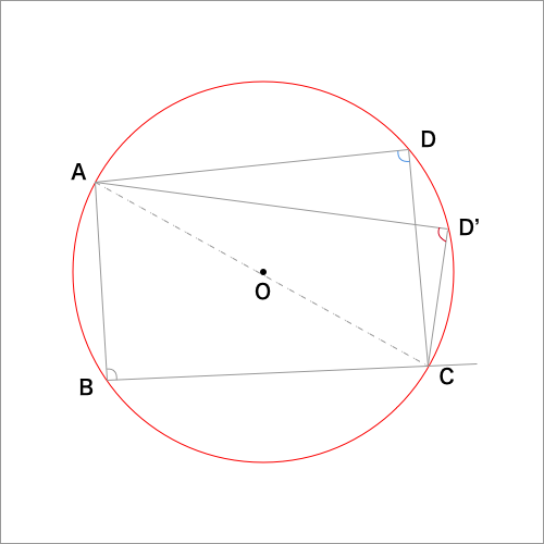 直線ACに関してDとD'は同じ側にあるから円周角の定理の逆により、4点A,C,D',Dは円Oの周上にある。
